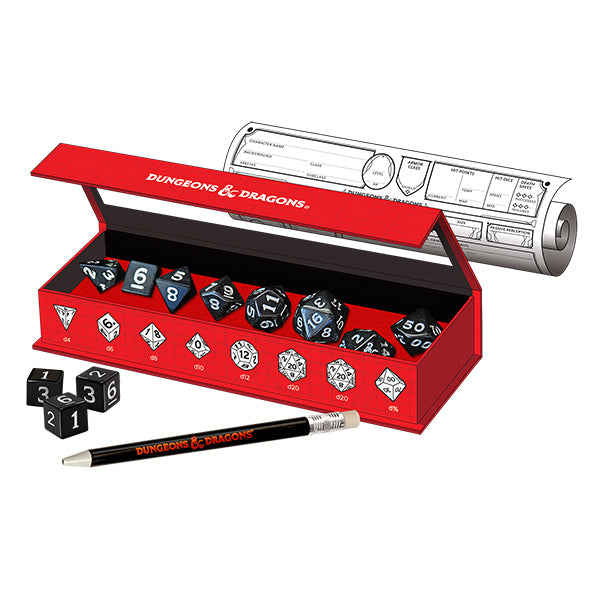 - 11-Piece Polyhedral Set: Provides a complete arsenal of D&D branded dice to begin your new adventure! Includes three additional D6 and one additional D20 for advantage/disadvantage rolls!