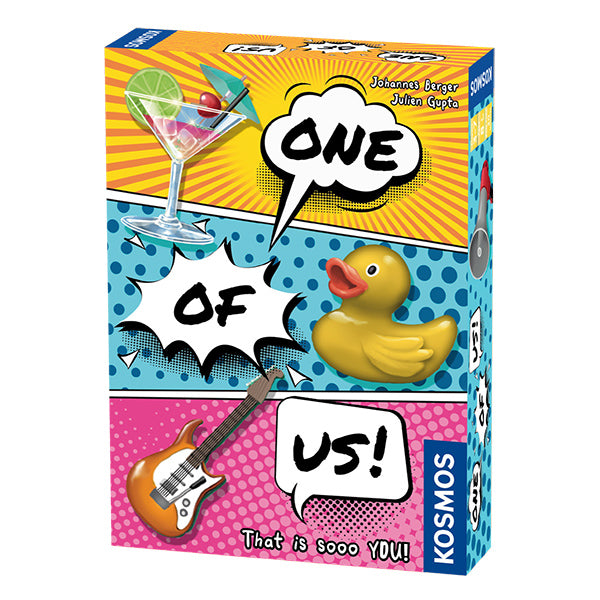 A cooperative party game of conjecture and laughs. Who do you think of when you see a cat? Who would best wear a daredevil parachute jumpsuit? And who of you would prefer to disappear to a desert island? In One of Us, you have to agree on which player you most associate with the card you’ve just urned over - and without discussing it! If the majority vote for the same person you score a point. Can you manage to be on the same wavelength and score ten points?